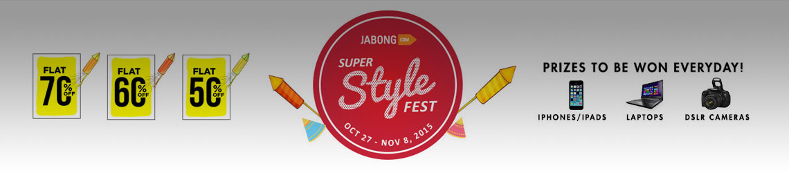 Jabong Super Style Fest Diwali Sale – Big Offers + 10% Cashback | Oct 27 – Nov 8. Big Prizes to be won Everyday + A Bumper Prize of 5 International Tickets. Flat 90% OFF Flash Sale Everyday.