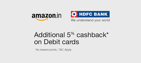 Get 5% cashback (in the form of reward points) on purchase on Amazon.in (mobile app and web and mobile site) on successful single transaction net of refunds on HDFC debit Cards on purchases of Rs. 5000 and above. Cancelled items/orders will not be eligible for cashback.