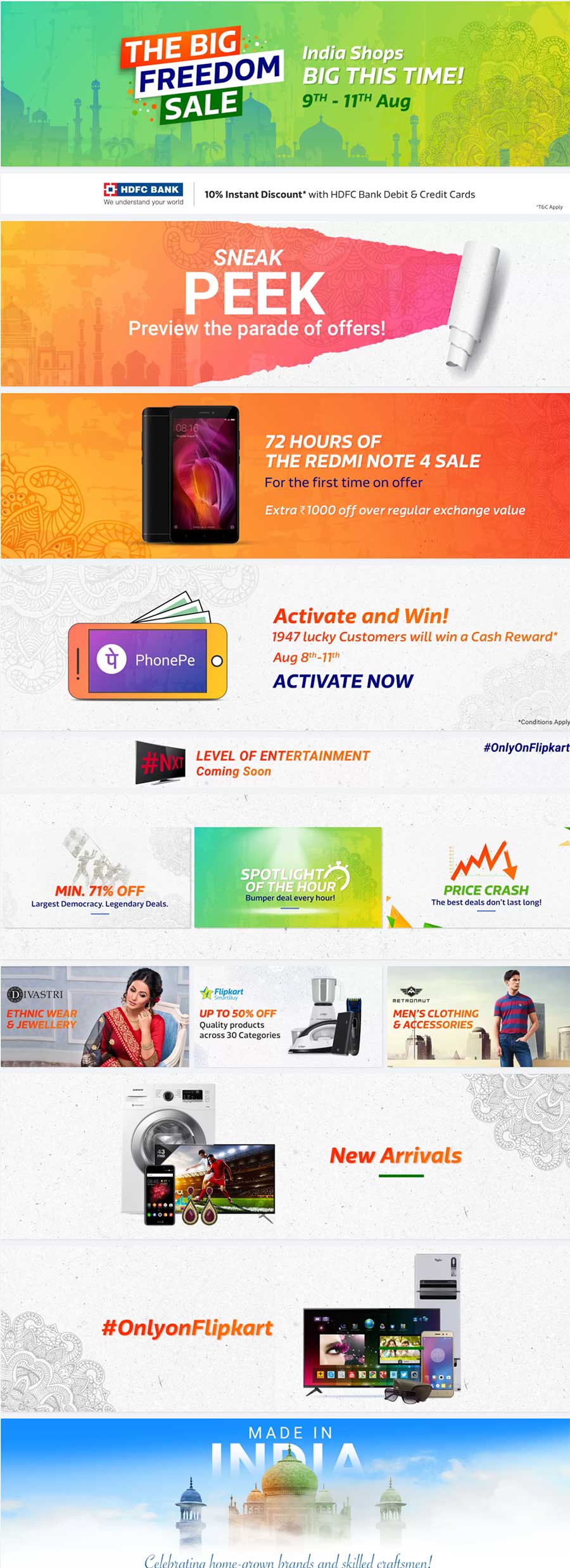 Shop at the Flipkart Big Freedom Sale (9-11 August) – Mega Deals + Extra 10% OFF on HDFC Cards. Flipkart’s ‘Freedom Day Sale’ offers are here providing customers a minimum 71% off on numerous products under various categories.