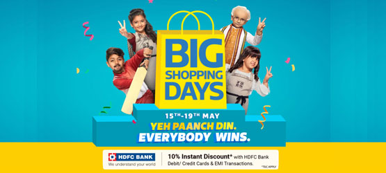 Shop at the Flipkart Big Shopping Days Sale from 15-19 May 2019 – Mega Discounts + 10% OFF on HDFC Cards.