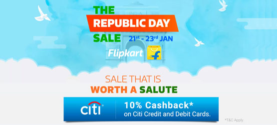 Shop at Flipkart Republic Day Sale from 21-23 Jan 2018 – Up to 80% OFF on Mobiles, Laptops, Electronics and more. Get additional 10% Cashback on Citi Bank Debit & Credit Cards and 15% Cashback on payments through PhonePe Wallet.