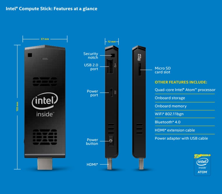 Transform your HDMI-ready TV or monitor into a fully functional computer with the Intel® Compute Stick. Stream. Work. Play. The Intel Compute Stick is ready to go out of the box. It offers the performance, quality, and value you expect from Intel at an inviting price.