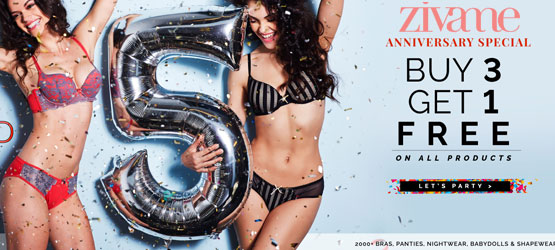 Zivame 5th Anniversary Sale – Buy 3 Get 1 FREE on all Lingerie! Use coupon code for additional 15% OFF on orders of Rs 1249 & above.